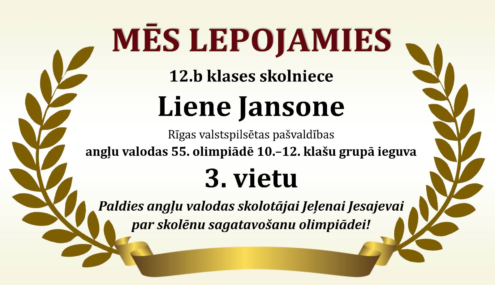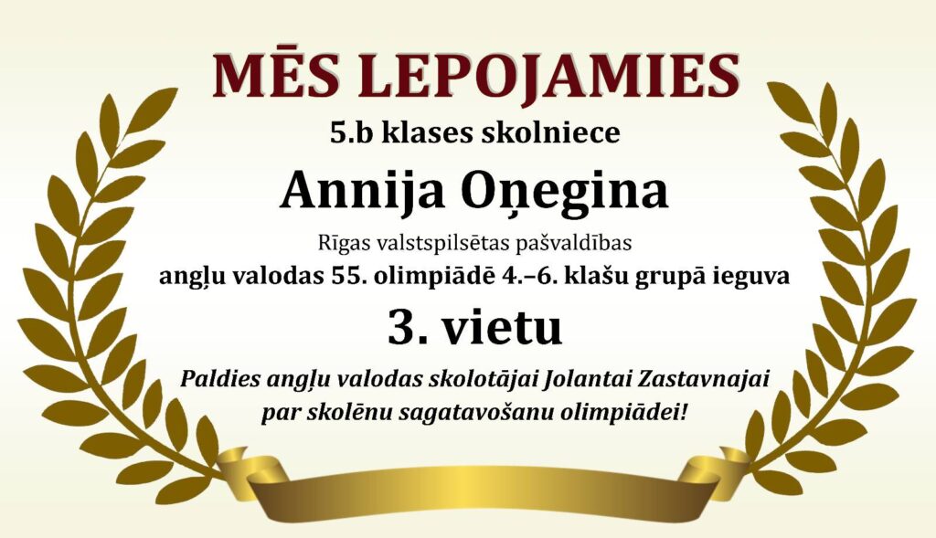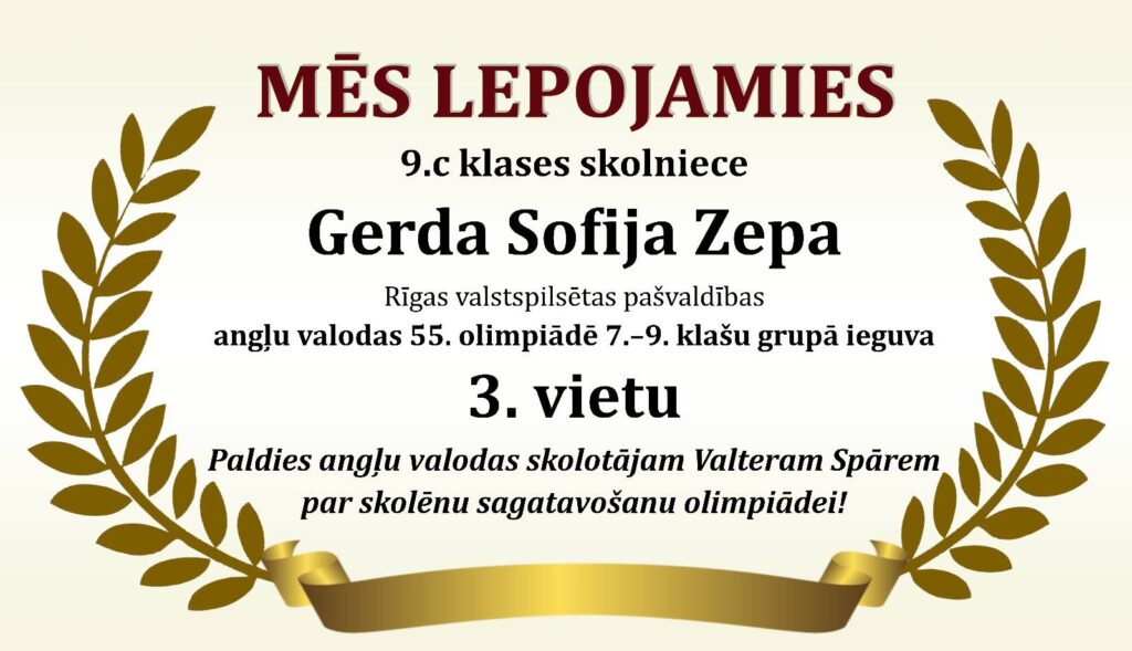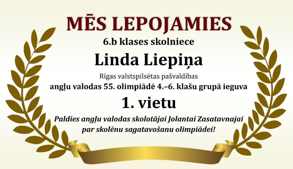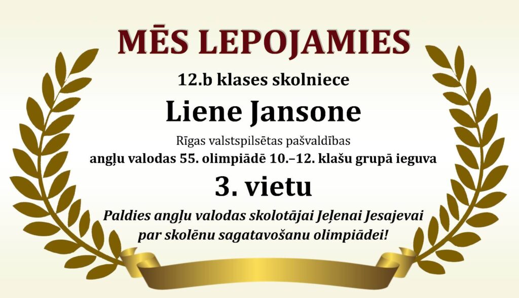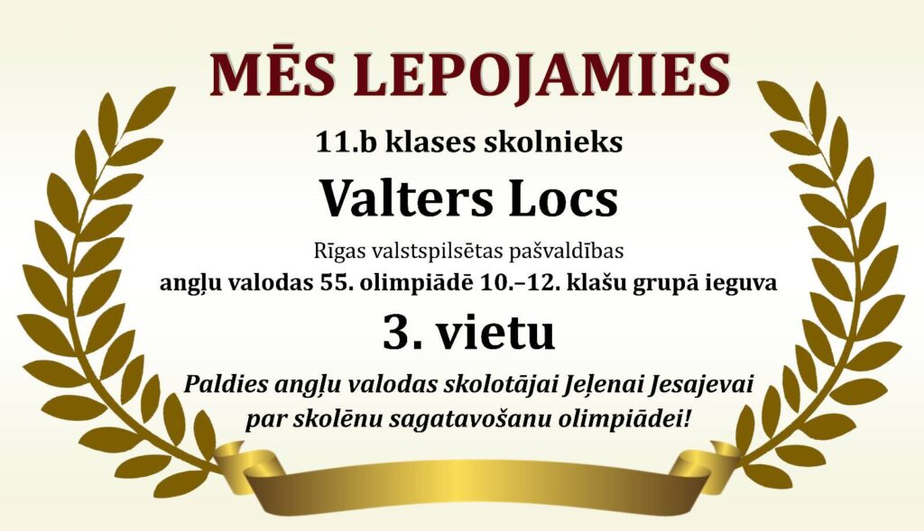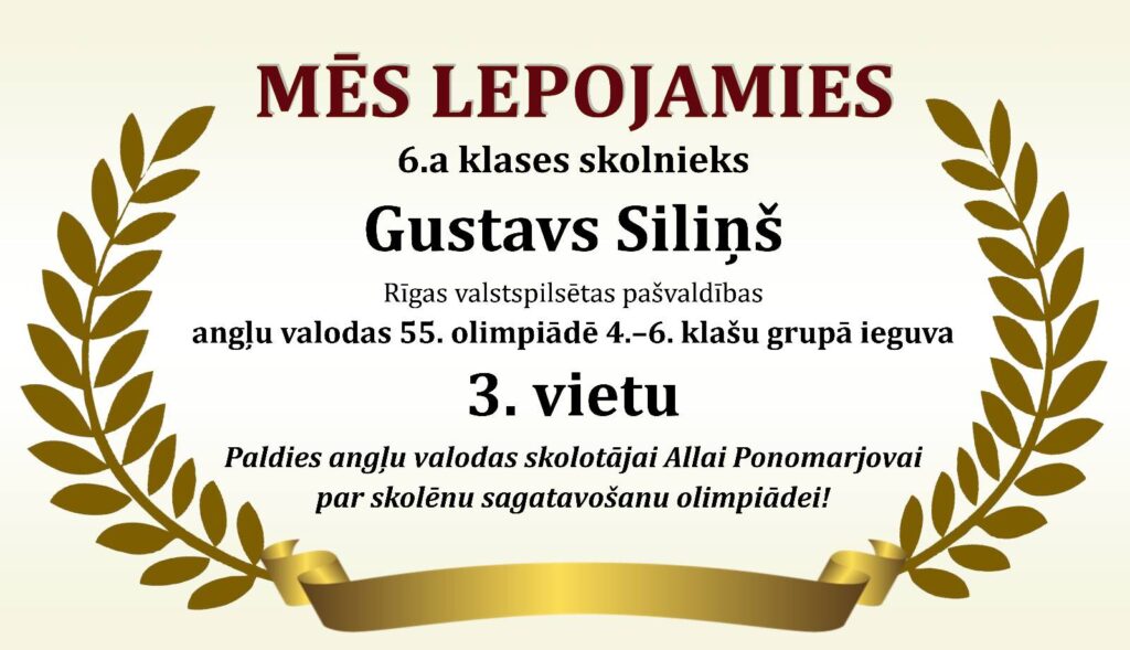 Godalgoti panākumi Rīgas valstspilsētas 55. angļu valodas olimpiādē Posted on 06/12/202506/12/2025 By Lotars Revizors Uncategorized Tags:Mācību sasniegumi