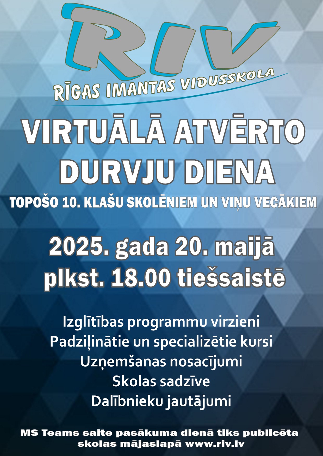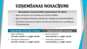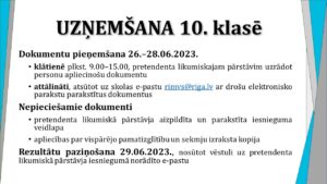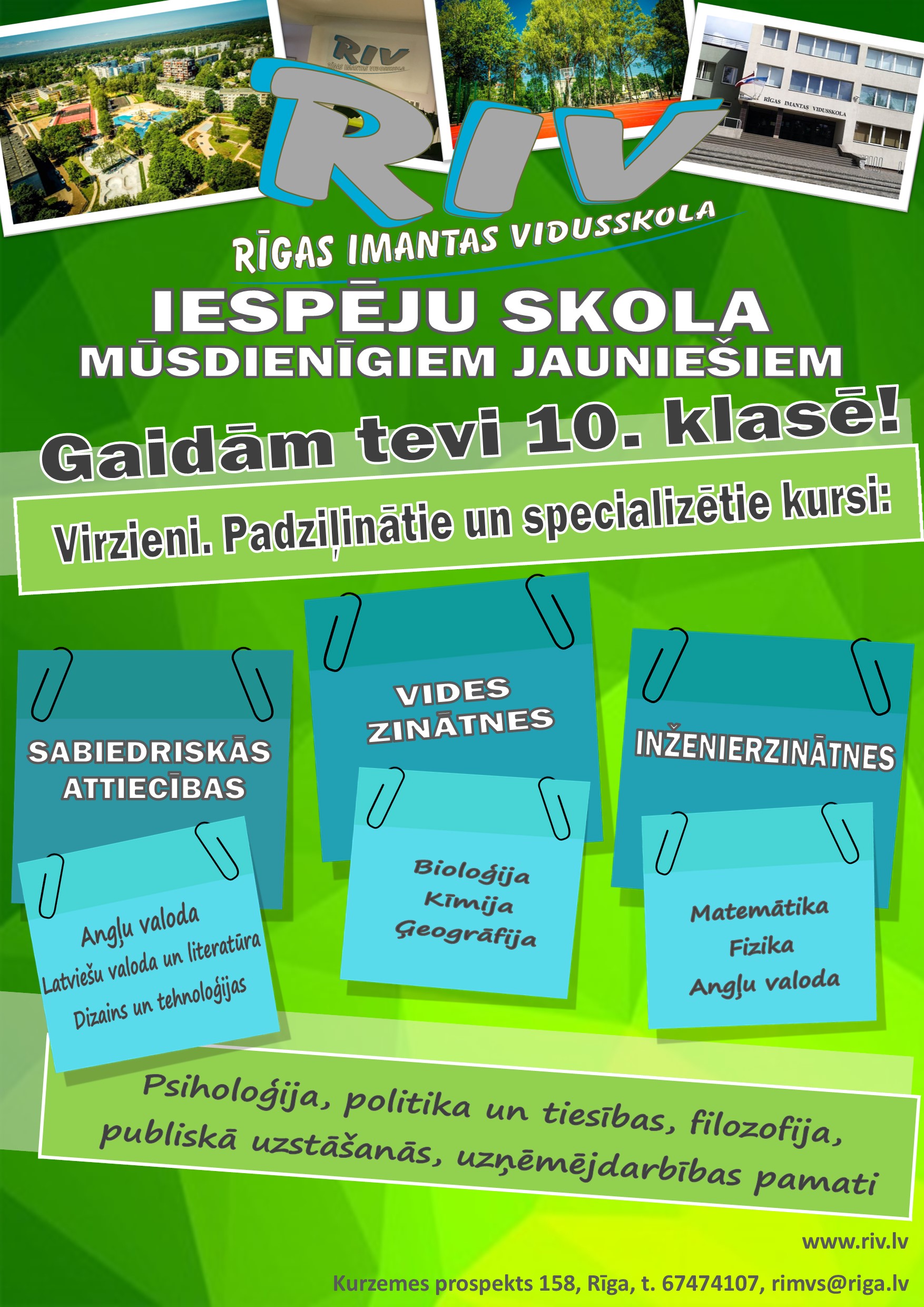 Uzņemšana 10. klasē Pārskats par SABIEDRISKO ATTIECĪBU, VIDES ZINĀTŅU UN INŽENIERZINĀTŅU virzieniem Vispārējās vidējās izglītības programma Izglītības un karjeras iespējas: Virziens SABIEDRISKĀS ATTIECĪBAS Virziens VIDES ZINĀTNES Virziens INŽENIERZINĀTNES *** Kārtība, kādā izglītojamie tiek uzņemti Rīgas Imantas vidusskolas vispārējās vidējās izglītības programmā ŠEIT Iesnieguma veidlapa